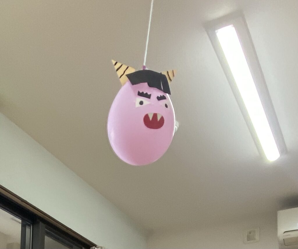 今日は節分の日♪ 「おには〜そと!」と朝から元気いっぱい保育園に元気な声が聞こえていました! 新聞を丸めた豆を元気に投げて遊んでいましたよ! そこへ鬼さんが登場!!鬼さんに気付いた子どもたちは、あまりの怖さに泣き出す子どもや、保育者の後ろに逃げる子ども、必死で豆を投げる子ども、鬼の姿を不思議そうに眺めている子どもなど… みんないろいろな感情を表に出して表現していました。 後に、優しい鬼だと分かると安心して笑顔が戻ってきましたよ。