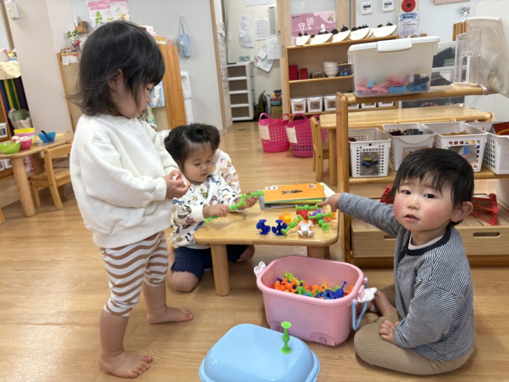 いつも好奇心旺盛のれんげぐみさん。 他のクラスで遊ぶ時間も大好きな3人です! さくらぐみさんにお邪魔すると、普段は遊べないおもちゃで夢中になって遊んでいます♪ 指先を使う遊びに挑戦したり、、、 おままごとも具材やお皿など種類がたくさんあって、目を輝かせながら遊んでいます! 美味しそうなご飯の絵本を見つけると、大急ぎでスプーンを持ってきてパクパクと食べていましたよ☺️