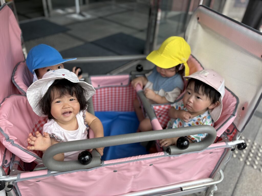 散歩車に乗ると、いつもと違う景色に目を輝かせながらあちこちキョロキョロと見ています😊
